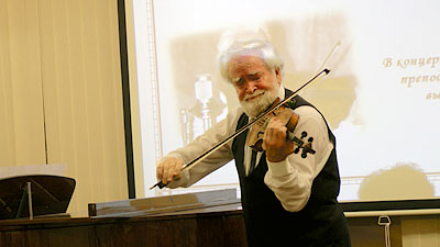 ![]() В этот праздничный вечер в зале собрались любители скрипичной музыки, ученики школы и их родители, коллеги музыканта. Со сцены звучали произведения П. Чайковского, М. Балакирева, Г. Венявского, Ж. Массне, М. Понсе в исполнении юбиляра.