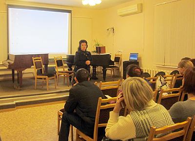 ![]() Г. В. Сметанина рассказала о предмете слушание музыки, о его значении для раннего музыкального и общеэстетического развития ученика, о пособиях и основных методах и приемах работы на уроке.
