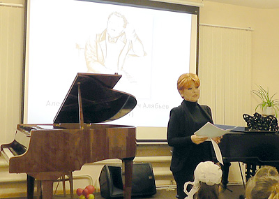 Концерт класса общего фортепиано2 декабря 2013 года состоялся ежегодный концерт класса общего фортепиано. Прозвучала музыка русских композиторов XIX века А.Алябьева, А.Варламова, А. Гурилёва, А.Даргомыжского, П. Чайковского, А.Бородина, Н.Римского-Корсакова. Концерт сопровождался рассказом педагогов Е.А. Мулюн, А.А. Егани, Г.В. Сметаниной о творчестве каждого композитора.
